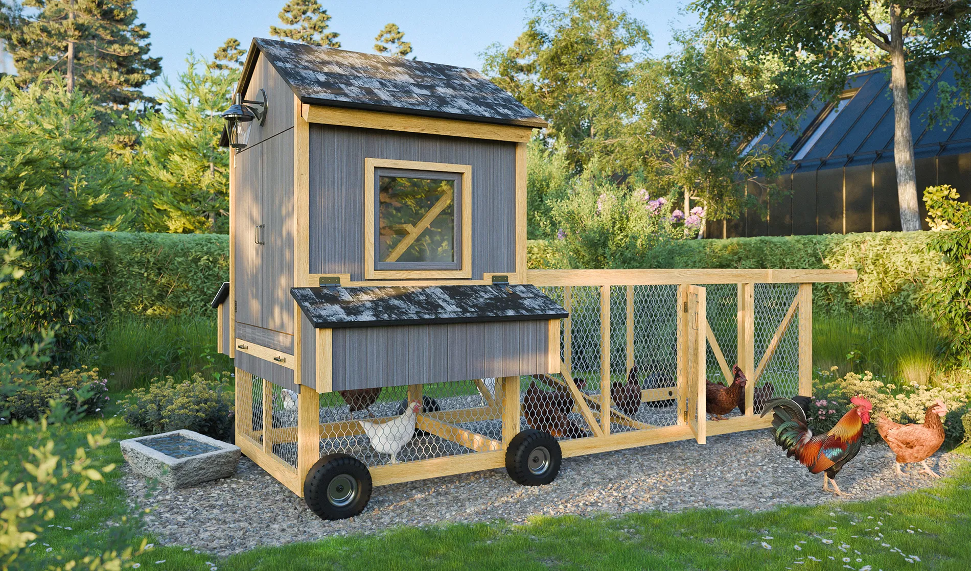 This thoughtfully designed coop features light-optimizing windows, an easy-clean litter tray, and comfortable perches for roosting, ensuring a natural habitat for your flock.