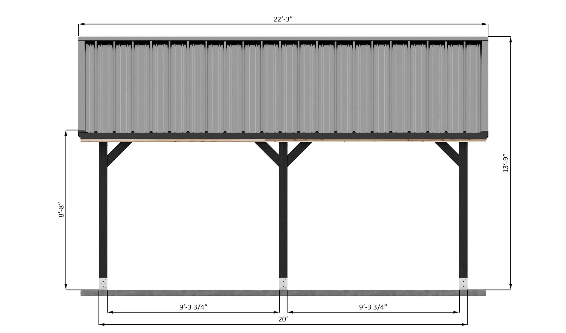 Introducing our detailed plans for a modern, freestanding 2 car carport that beautifully blends form and function. With its clean lines, symmetrical gabled roof, and exposed timber frame, this carport is designed to be a handsome architectural feature that complements a variety of home styles.