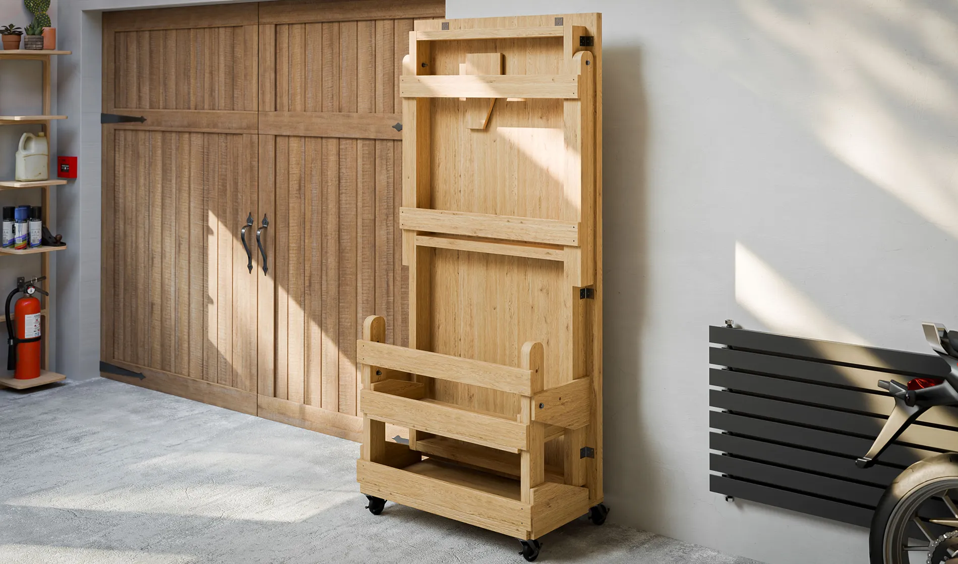 Bring your workshop to life with our DIY folding workbench plans, designed to help you create a smart, modern, and incredibly practical workspace solution. These detailed plans guide you through constructing a unique, transformable workbench that combines a mobile storage cart and a folding leg assembly to form a generous 6×3 foot work surface when open, yet folds down into a compact, mobile unit for easy storage.