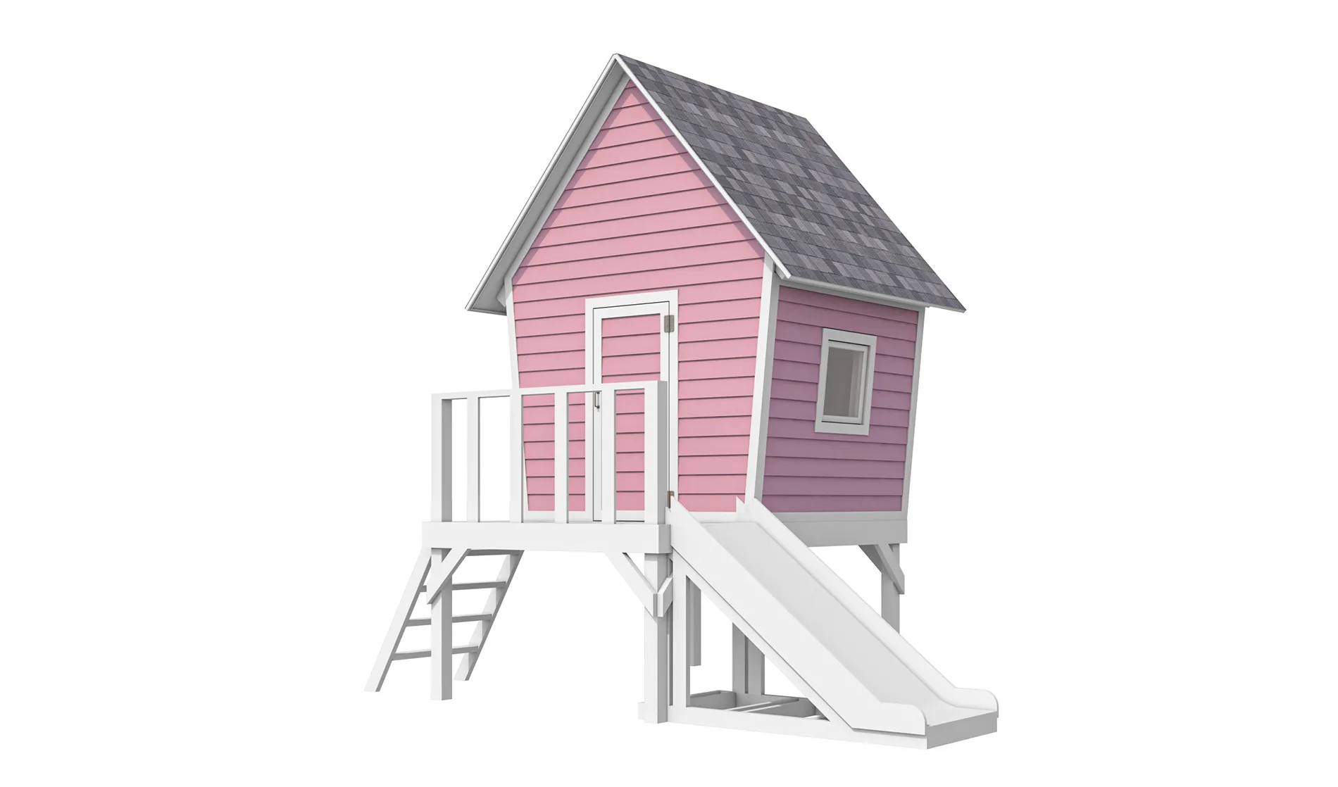 An elevated wooden playhouse with a sturdy platform, safety railing, ladder, and slide—creating a fun and adventurous outdoor play space for kids.