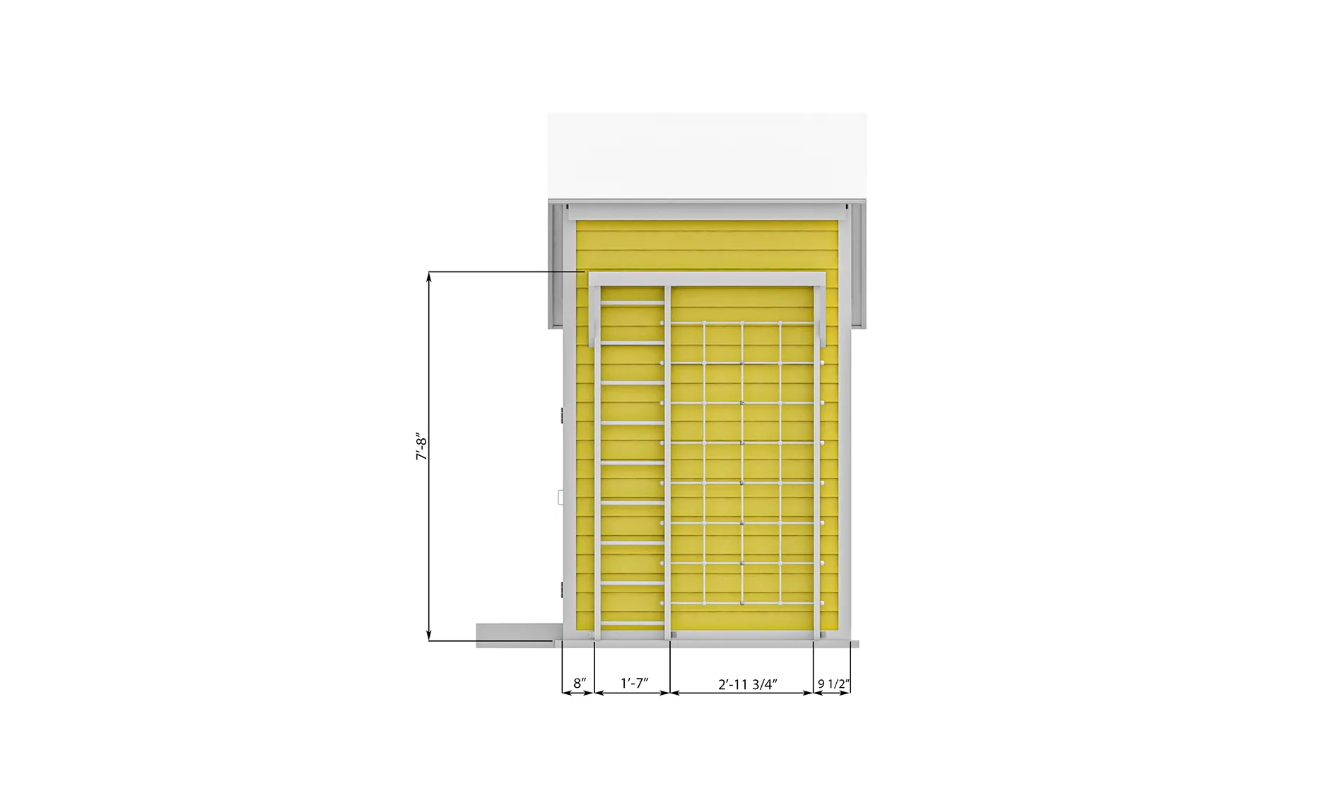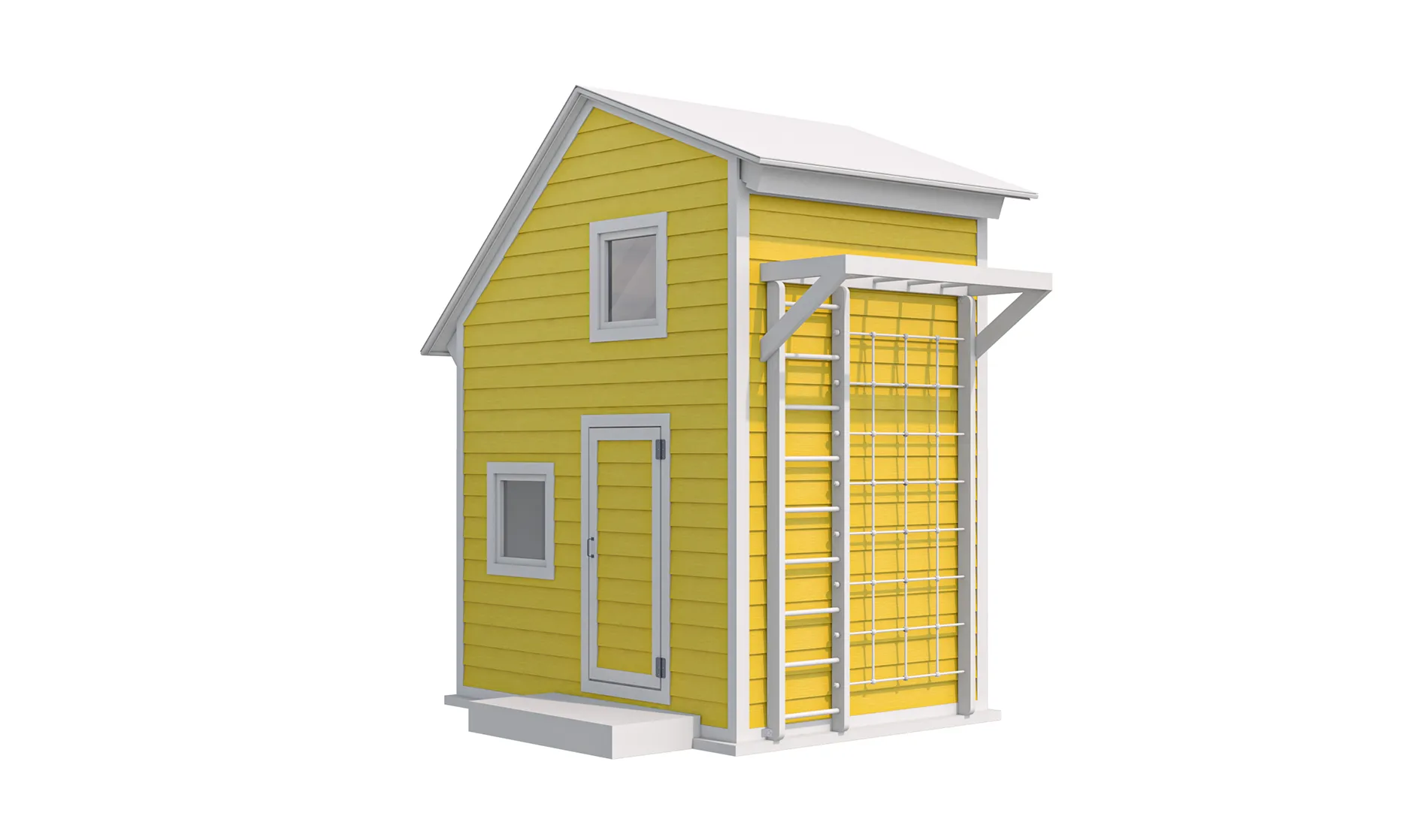 A tall, two-story playhouse with a compact footprint, functional windows, and an attached climbing wall—perfect for active play and creative outdoor fun.