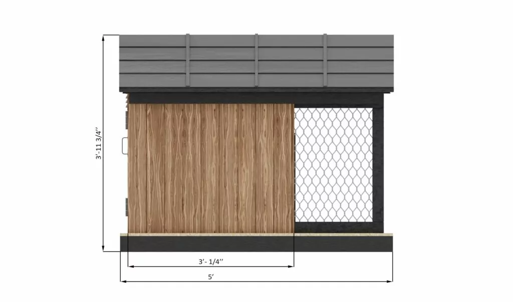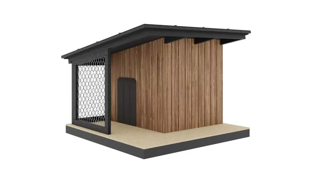The unique two-zone layout offers a cozy, den-like enclosure for protection and privacy, complemented by an open-air section with a large wire mesh panel for ventilation and visibility. The offset door helps block drafts, while the single-slope roof provides effective water runoff and added coverage.