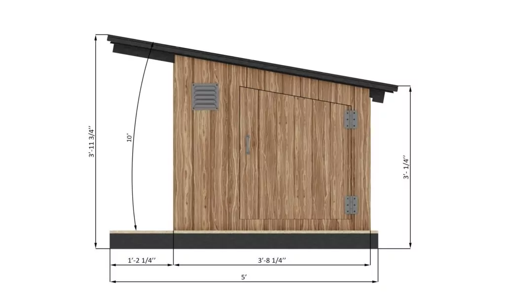 We offer dog house plans in various sizes to accommodate different breeds. Our most popular sizes include 5' x 5', 6' x 4', and 6' x 6' models. Each plan includes both Imperial and Metric measurements. We recommend choosing a size that allows your dog to stand, turn around, and lie down comfortably.