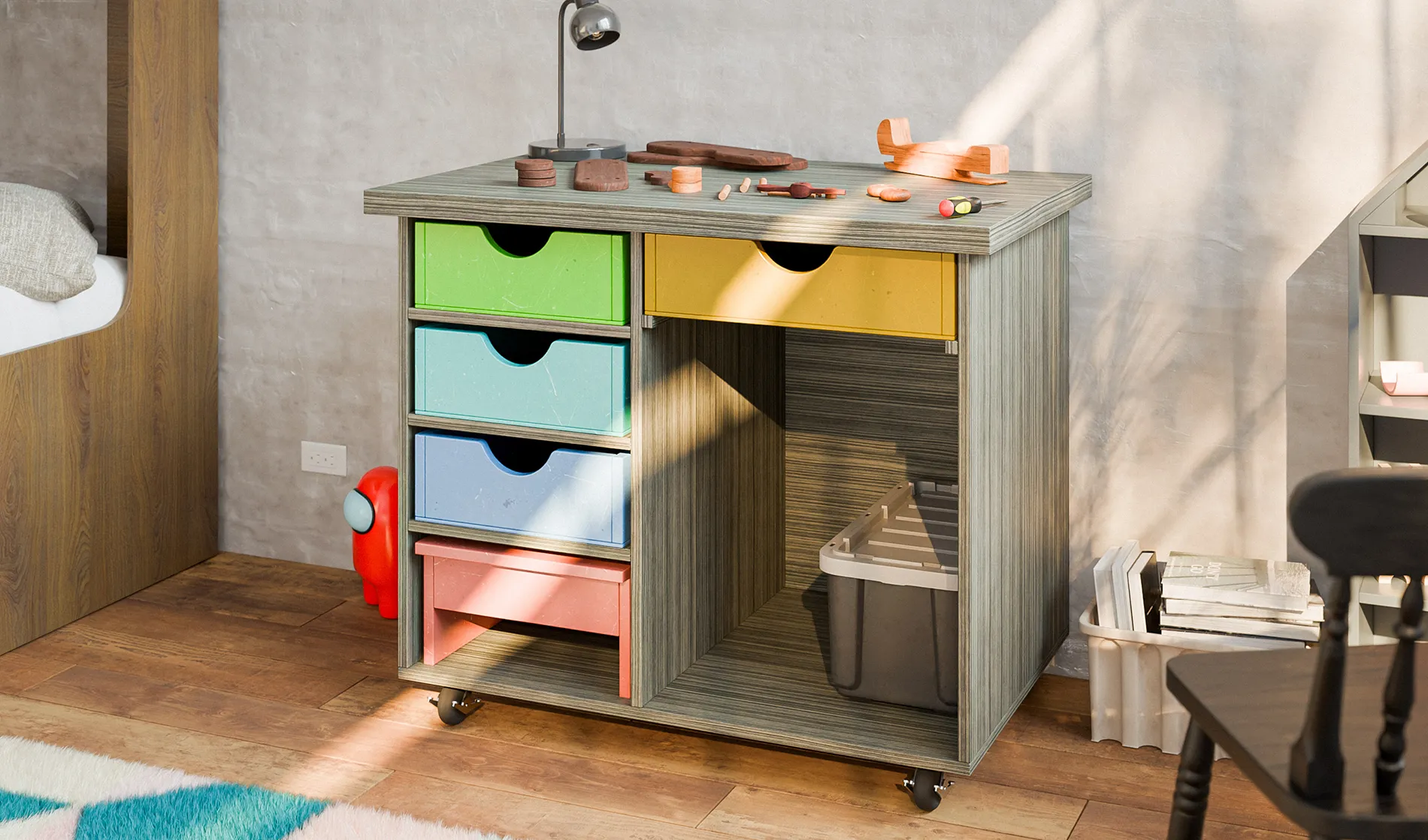 Built with safety in mind, this workbench features a snag-free design with semi-circular cutouts for drawer pulls, creating a smooth surface that’s ideal for young children. Its low height ensures accessibility and promotes independence, while the versatile design allows it to function as an art station, craft table, building block surface, or even a first homework desk.