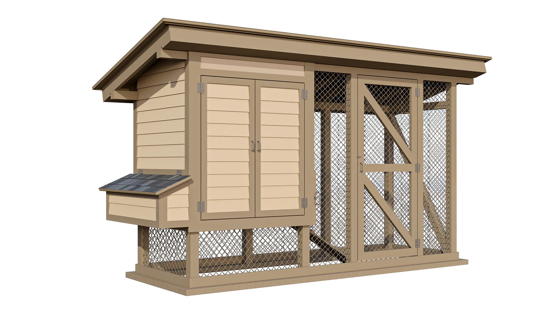 Our digital DIY chicken coop plans provide a comprehensive guide to building a practical, secure, and visually appealing home for your backyard flock. The design features a modern shed aesthetic with a single-slope roof, offering a simple, cost-effective, and practical structure that complements most homes and gardens.