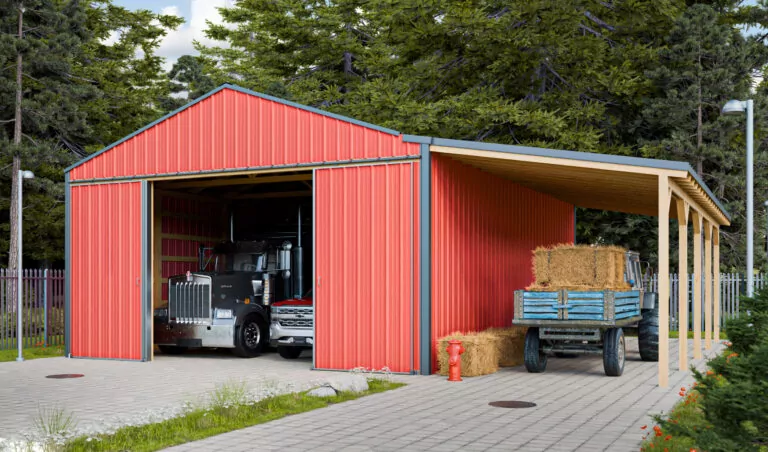 The barn design includes large sliding doors at the front for smooth vehicle entry, generous interior space with high ceilings to fit tall machinery or optional lofts, and an attached lean-to that provides additional covered storage. The lean-to is ideal for keeping equipment, firewood, feed, or smaller vehicles protected from the elements while keeping the main barn free for larger items.